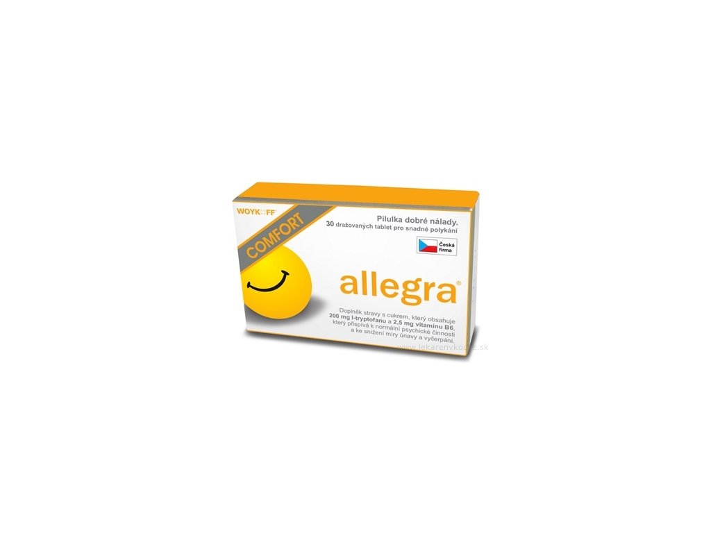 allegra COMFORT je výživový doplnok s obsahom unikátnej kombinácie esenciálnej aminokyseliny l-tryptofan, ktorá je jediným prekurzorom neurohormónov dobrej nálady serotonínu, melatonínu a vitamínu B6, ktorý prispieva k normálnej psychickej činnosti, zníženiu miery stresu, únavy a vyčerpania a zároveň zvyšuje biologickú dostupnosť l-tryptofanu v neurónoch. Prípravok tiež obsahuje malé množstvo sacharózy (166 mg v jednej tablete), ktorá prispieva k výrazne rýchlejšiemu transportu l-tryptofanu cez hematoencefalickú bariéru a tým k zosilneniu účinku a rýchlejšiemu nástupu účinku.