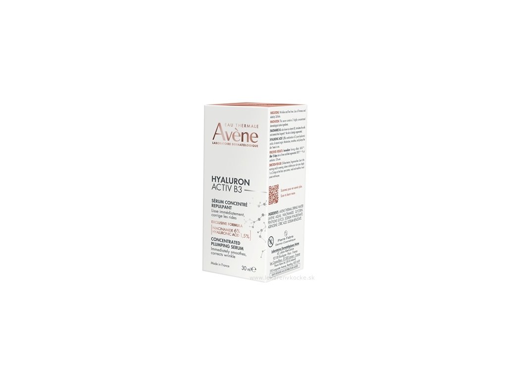 S vekom sa všetko zrýchľuje. Starnúcich buniek je čím ďalej viac a pokožka funguje pomalšie. Dermatologické laboratóriá Avène vytvorili Hyaluron Activ B3 sérum s vysokou koncentráciou čistej kyseliny hyalurónovej (1,5 %: s vysokou aj nízkou molekulárnou hmotnosťou) a niacínamidom (6 %), ktoré pôsobia na príčiny starnutia a predlžujú životnosť buniek*. Vďaka svojmu minimalistickému zloženiu, ktoré obsahuje iba 8 zložiek, pôsobí toto sérum na vypnutie pleti už po 15 dňoch používania. Po 15 dňoch je pokožka vypnutá, pevnejšia a pružnejšia**: skutočný účinok v tej najčistejšej podobe. Tento prípravok bez parfumácie, testovaný na citlivej pleti, je vhodný pre všetky partie tváre, dokonca aj okolie očí.
