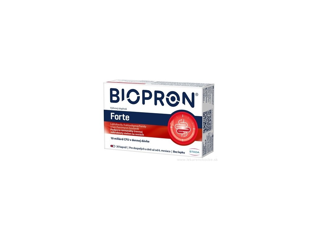 Výživový doplnok Biopron® FORTE obsahuje jedinečnú kombináciu baktérií (Lactobacillus helveticus, Lactobacillus rhamnosus) a kvasiniek (Saccharomyces boulardii) a fruktooligosacharidy. Obsahuje 10 miliárd CFU (živých mikroorganizmov) v dennej dávke (v 2 kapsulách).