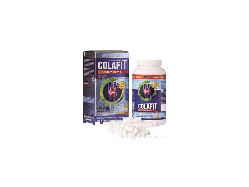 Výživový doplnok, balenie sa skladá zo 60 kociek Colafitu a 60 tabliet na cmúľanie vitamínu C .