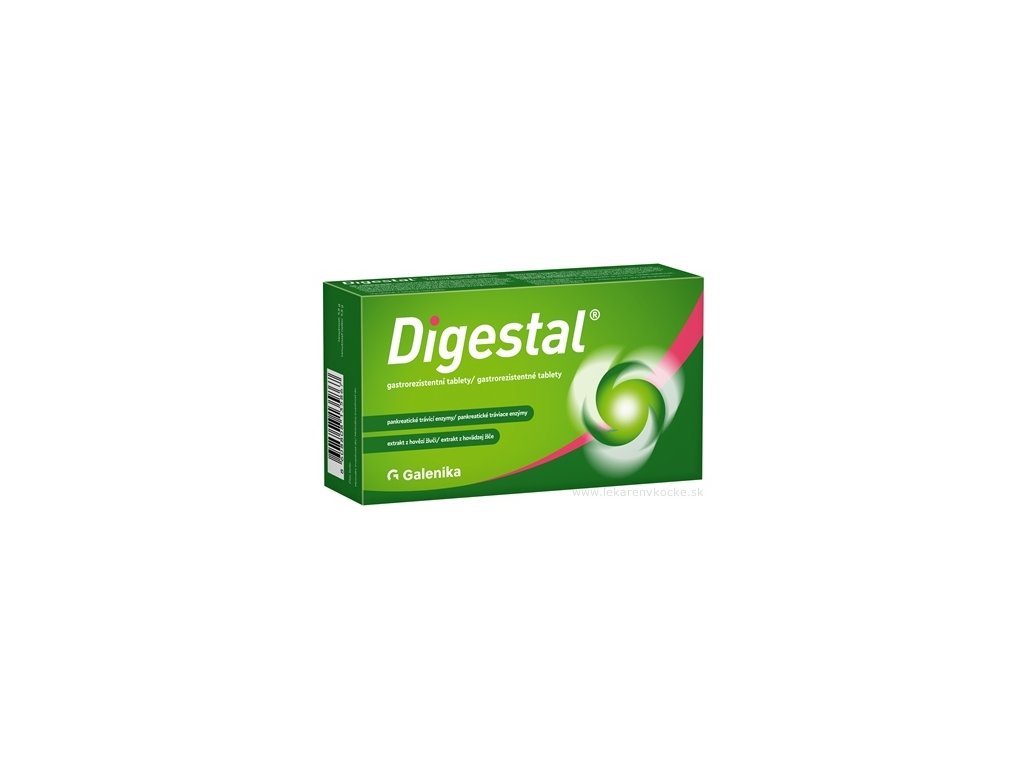 Digestal sú gastrorezistentné tablety určené na podporu správneho trávenia. Obsahujú kombináciu prírodných pankreatických enzýmov a extraktu z hovädzej žlče, ktoré spoločne pomáhajú efektívnejšie rozkladať a vstrebávať bielkoviny, tuky a sacharidy z potravy. Pravidelné užívanie Digestalu zmierňuje pocit ťažkosti po jedle, nafukovanie a podporuje správne trávenie, čo je ideálne najmä po ťažkých alebo mastných jedlách. Tablety majú špeciálny gastrorezistentný obal, vďaka ktorému sú enzýmy chránené pred žalúdočnými kyselinami a uvoľňujú sa až v črevách, kde majú optimálny účinok.