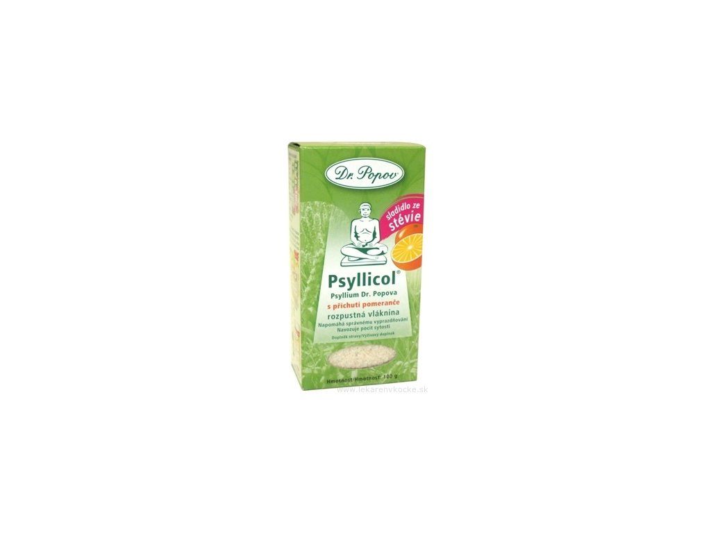 Výživový doplnok. Psyllicol® Psyllium Dr. Popova s príchuťou pomaranča. Vynikajúca rozpustná vláknina s ovocnou chuťou. Obsahuje vysoko kvalitné Psyllium Dr. Popova, ktoré zvyšuje dennú spotrebu vlákniny, v kombinácii s ochucujúcou zložkou.