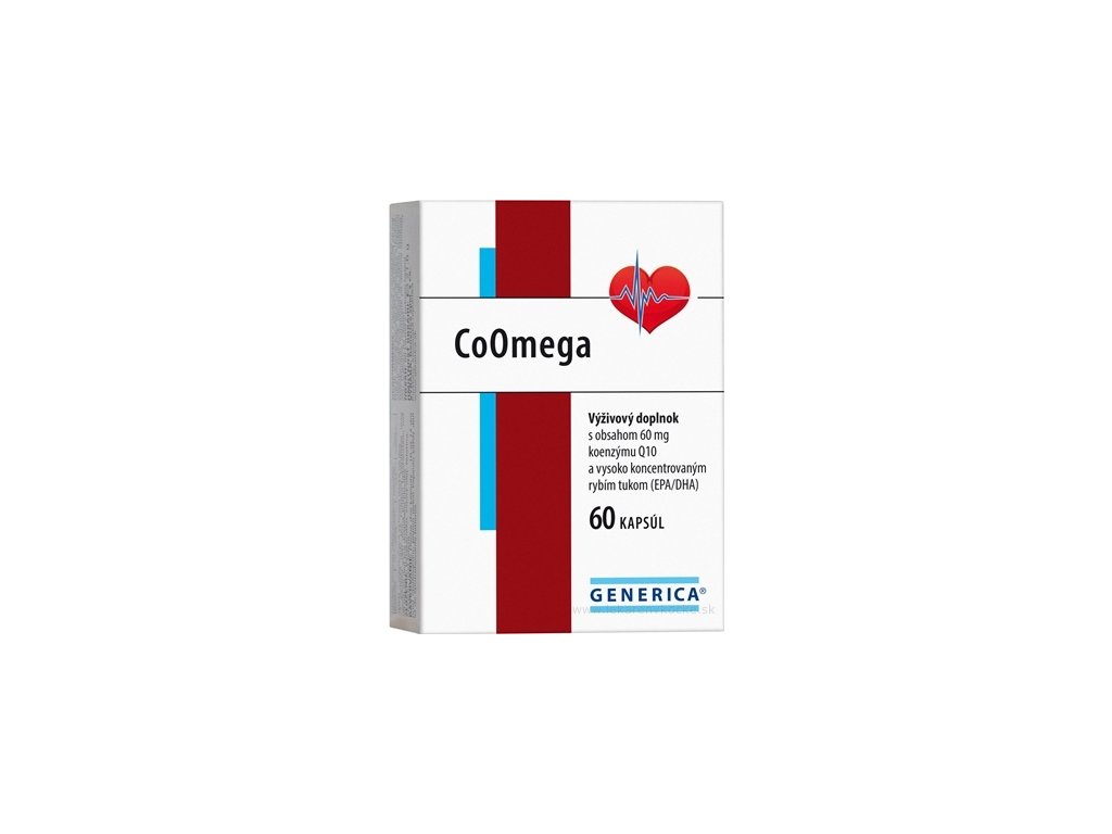 Výživový doplnok GENERICA CoOmega s obsahom 60 mg koenzýmu Q10 a vysoko koncentrovaným rybím tukom (EPA/DHA).