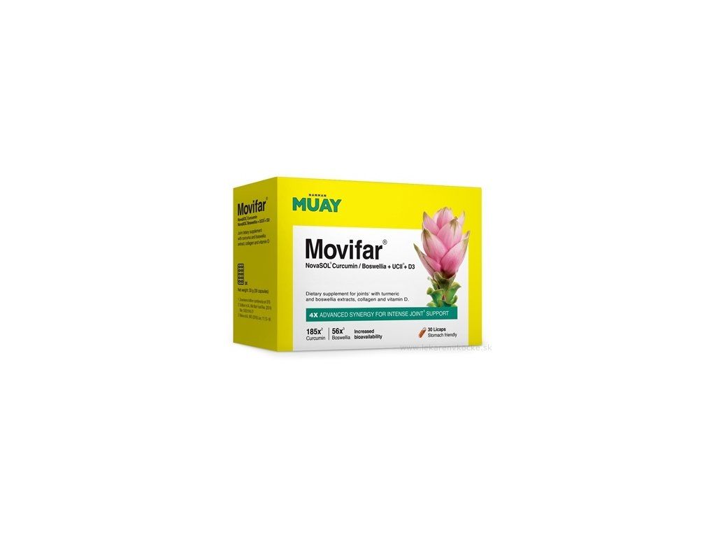 Vďaka pokročilej micelárnej technológii NovaSOL pre lepšiu biologickú dostupnosť výťažkov z boswellie a kurkumy a obsahu kolagénu UC-II, ktorý zachováva trojrozmernúštruktúru natívneho kolagénu, poskytuje Movifar optimálnu podporu pre vaše telo, aby si zachovalo svoju prirodzenú funkciu a odolnosť. Extrakty z boswellie a kurkumy prispievajú k udržaniu zdravých kĺbov a kostí. Vitamín D prispieva k udržaniu zdravých kostí a funkcie svalov a k normálnemu fungovaniu imunitného systému.