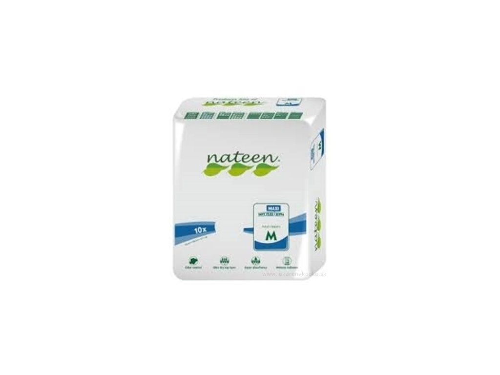 Plienky inkontinenčné nateen COMBI MAXI M sú anatomicky tvarované, vhodné na ťažkú inkontinenciu moču a stolice. Sú určené pre mužov aj ženy, mobilných aj imobilných pacientov. Zabezpečujú pocit sucha, trojité absorbčné jadro zvyšuje schopnosť absorbovať tekutiny a zápach, sú priedušné, vyrobené z netkanej nealergénnej textílie. Obsahuje indikátor vlhkosti.