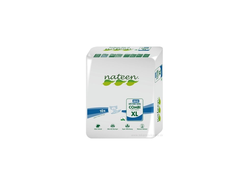 Plienky inkontinenčné nateen COMBI MAXI XL sú anatomicky tvarované, vhodné na ťažkú inkontinenciu moču a stolice. Sú určené pre mužov aj ženy, mobilných aj imobilných pacientov. Zabezpečujú pocit sucha, trojité absorbčné jadro zvyšuje schopnosť absorbovať tekutiny a zápach, sú priedušné, vyrobené z netkanej nealergénnej textílie. Obsahuje indikátor vlhkosti.