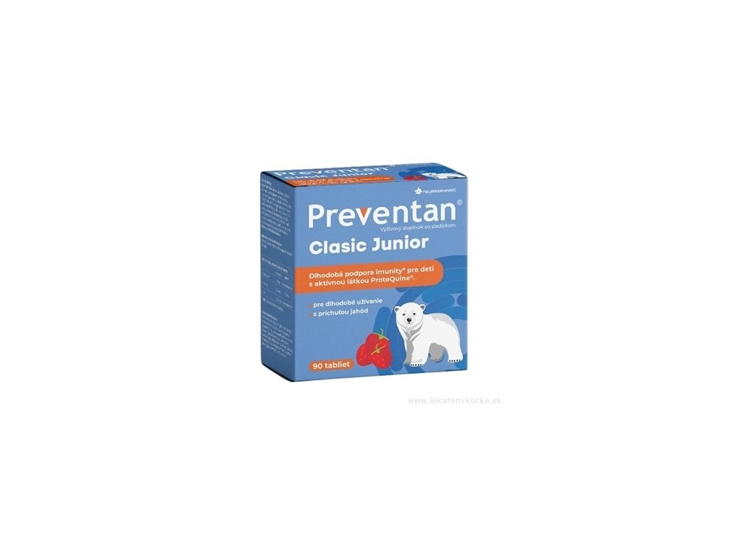 Preventan® Clasic Junior obsahuje originálne aktívne látky ProteQuine® (aminokyseliny, oligopeptidy, nukleotidy) a inulín. Navyše je obohatený o vitamín C, ktorý prispieva k normálnej funkcii imunitného systému a k zníženiu miery únavy a vyčerpania. Inulín je rozpustná vláknina, pôvodom z čakanky, ktorá dopĺňa tento prípravok o ďalšiu aktívnu zložku. So sladidlom prírodného pôvodu z rastliny stévia sladká.