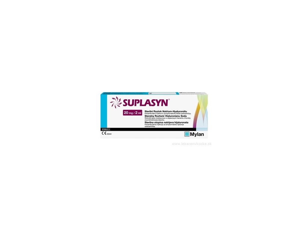VLASTNOSTI: Kyselina hyalurónová je prototyp širokého spektra sacharidových biopolymérov (glykozaminoglykánov), dôležitých zložiek všetkých extracelulárnych štruktúr tkanív vrátane chrupavky a synoviálnej tekutiny. Účinnou látkou SUPLASYN-u je kyselina hyalurónová s definovanou dĺžkou molekulárneho reťazca a s vysokým stupňom čistoty. Podanie SUPLASYN-u do synoviálneho priestoru pomôže normalizovať kĺb po artrocentéze.