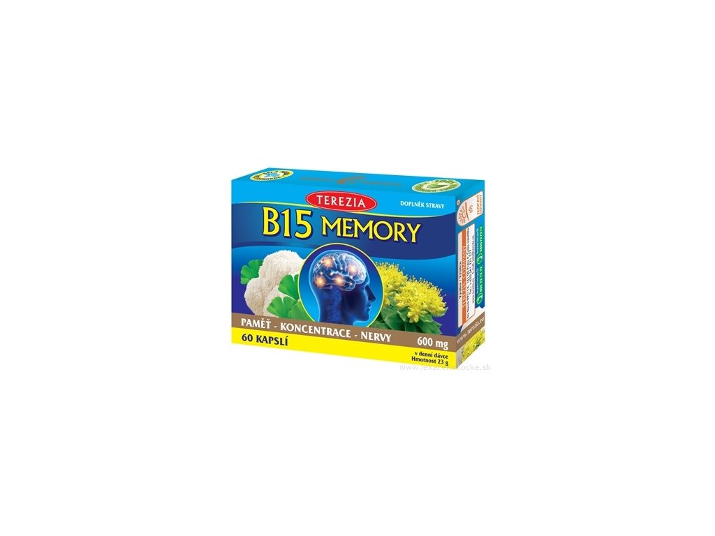 B15 MEMORY je unikátny produkt s obsahom zdraviu prospešnej huby a rastlín. Priaznivo pôsobí pri rekonvalescencii po narkóze, pre zlepšenie pamäti, koncentrácie a kognitívnych funkcií a je vhodný pre všetkých s vysokými psychickými nárokmi (študenti, manažéri, seniory). Korálovec ježatý je veľmi vzácna huba bohatá na polysacharidy a polypeptidy s vysokým obsahom vlákniny. Kurkuma dlhá podporuje funkciu nervovej sústavy. Bakopa drobnolistá podporuje koncentráciu a pamäť, čo je dôležité najmä pre ľudí v starobe z dôvodu fyziologického procesu starnutia, podporuje schopnosť učiť sa a pomáha udržovať dobré kognitívne funkcie. Rozchodnica ružová má priaznivý vplyv na únavu a bolesti hlavy vyvolané stresom, pomáha stimulovať vnímanie a zlepšuje stav mysle. Ginkgo dvojlaločné prispieva k dobrej nervovej rovnováhe, podporuje duševnú rovnováhu a pomáha udržovať pamäť, ktorej výkonnosť vekom klesá.