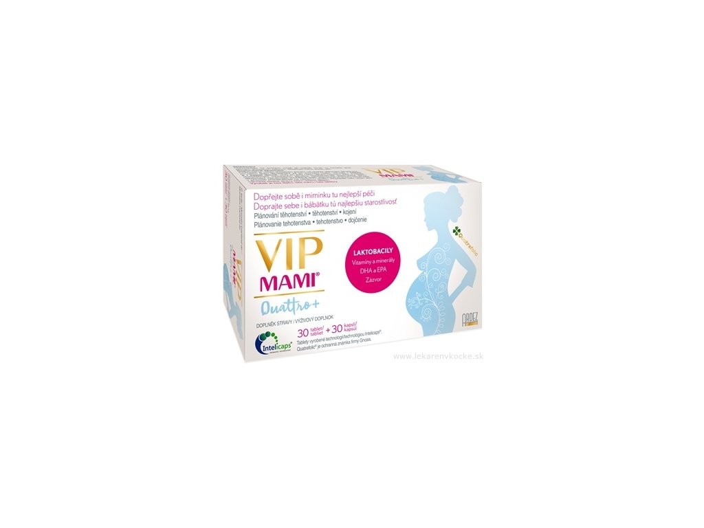 VIP MAMI Quattro je komplexný multivitamín s obsahom vitamínov a minerálov, laktobacilov, DHA /EPA a zázvoru. Obsahuje aktívnu kyselinu listovú vo forme folátu 4. generácie Quatrefolic. Bol vyvinutý odborníkmi priamo na mieru mamičkám podľa najnovších poznatkov a s maximálnym dôrazom na inovatívne zloženie a kvalitu.