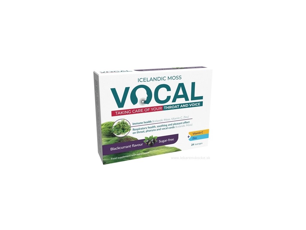 Výživový doplnok so sladidlami, islandským lišajníkom, vitamínom C a zinkom. Vocal obsahuje kombináciu islandského lišajníka, vitamínu C a zinku. Islandský lišajník (Cetraria inslandica) má priaznivé účinky na hrdlo a hlasivky. Podporuje zdravie sliznice úst a hrdla. Vitamín C a zinok prispievajú k správnemu fungovaniu imunitného systému a k ochrane buniek pred oxidačným stresom. Zinok zohráva úlohu v procese delenia buniek.