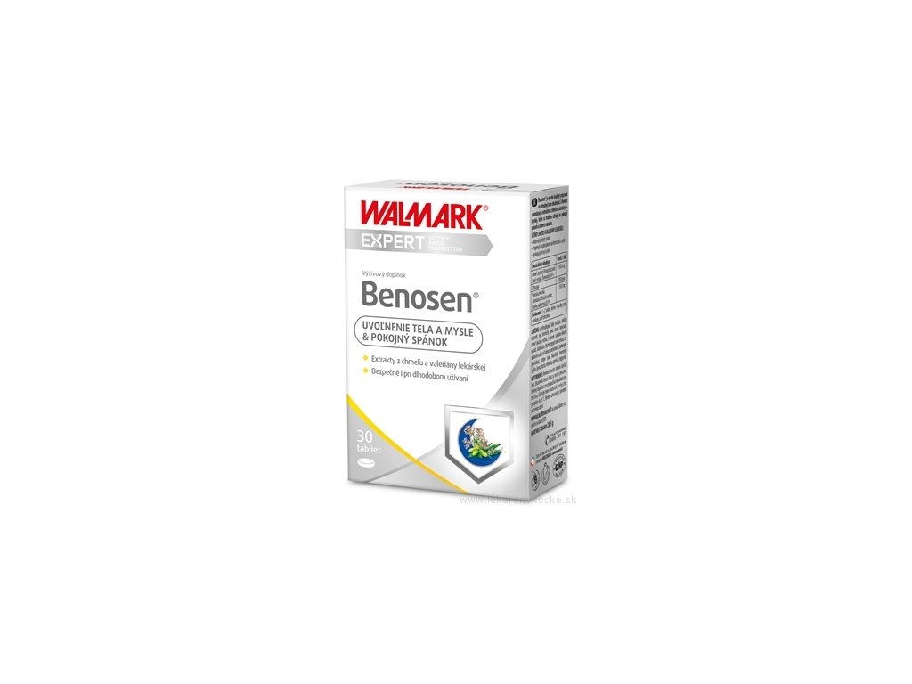 WALMARK Benosen je výživový doplnok vo forme tabliet vytvorený pre tých, ktorí potrebujú podporiť prirodzené zaspávanie, relaxáciu a mentálne uvoľnenie. Obsahuje kombináciu L-theanínu a rastlinných extraktov z chmeľu (Humulus lupulus) a valeriány lekárskej (Valeriana officinalis). Tieto tradičné byliny sú oddávna používané na upokojenie organizmu, navodenie relaxácie a podporu kvalitného spánku.