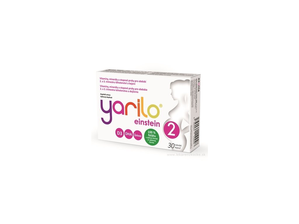 YARILO einstein 2 cps je komplexný výživový doplnok navrhnutý špeciálne pre obdobie druhého a tretieho trimestra tehotenstva a pre celé obdobie dojčenia. V tomto citlivom období potrebujú ženy zvýšený príjem viacerých vitamínov, minerálov a omega-3 mastných kyselín, ktoré sú zásadné pre správny vývoj plodu a pre podporu organizmu matky.