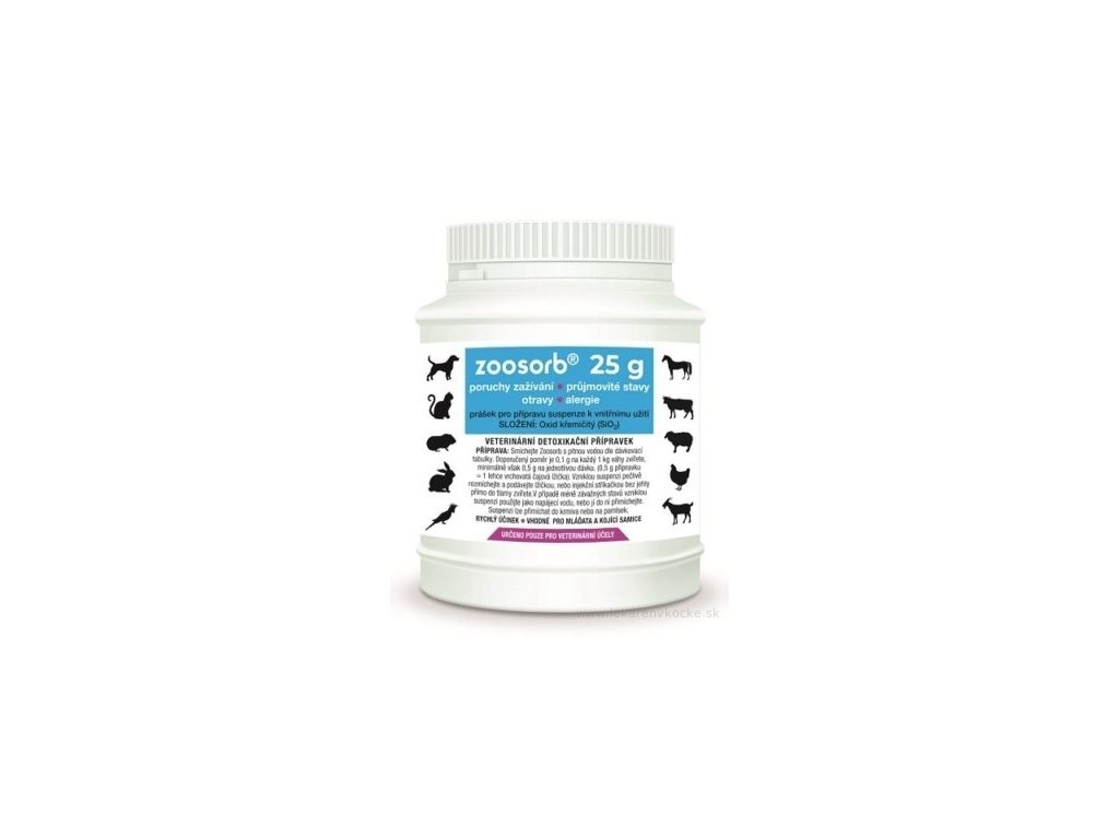 Zoosorb prášok 25 g je rýchlo pôsobiaci veterinárny prípravok určený pre cicavce a vtáky, ktorý slúži na podporu trávenia, riešenie hnačkových stavov a pomoc pri akútnych otravách či alergických reakciách. Ide o účinný adsorbent na báze oxidu kremičitého (SiO₂), ktorý na seba viaže škodlivé látky, toxíny či alergény a pomáha ich bezpečne odviesť z organizmu zvieraťa.